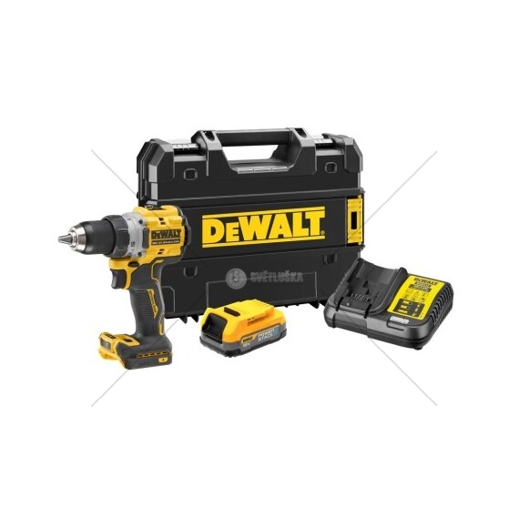 Profesionální akumulátorová vrtačka/šroubovák DeWalt DCD800E1T-QW s napětím 18V, dodávaná s jednou 1,7Ah baterií. Kompaktní a výkonné nářadí pro profesionální použití.