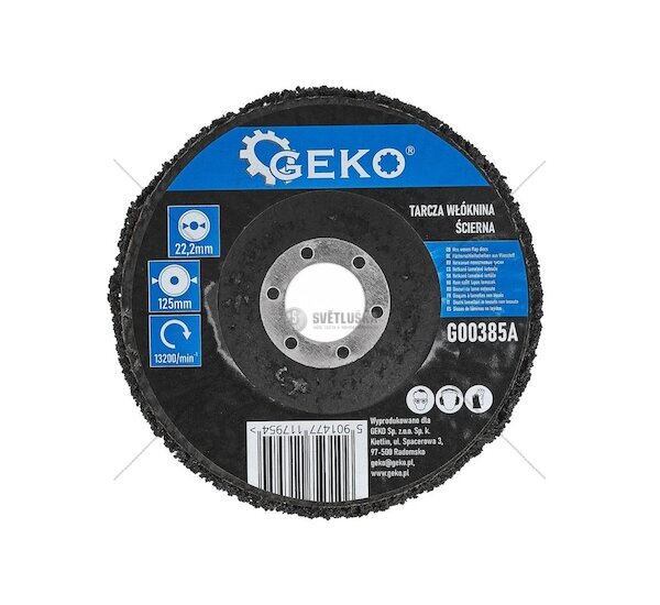 Netkaný brusný kotouč GEKO o průměru 125 mm pro úhlové brusky, určený k efektivnímu čištění a odstraňování rzi, nátěrů a nečistot z kovů, nerezové oceli a plastů. Otevřená struktura z netkané textilie s karbidem křemíku zabraňuje ucpávání a přehřívání materiálu.