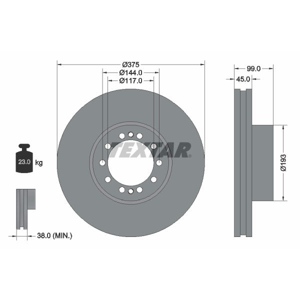 Brzdový kotouč DAF 55 o průměru 375 mm určený pro přední nápravu. Tento kotouč je vnitřně ventilovaný, což zajišťuje efektivnější odvod tepla a zlepšuje brzdný výkon. Jeho konstrukce a rozměry jsou navrženy pro optimální kompatibilitu s brzdovým systémem vozidel DAF 55. Kotouč má vnější průměr 375 mm, tloušťku 45 mm a výšku 99 mm. Minimální povolená tloušťka kotouče je 38 mm, což zajišťuje bezpečnost a spolehlivost brzdného systému. Vnitřní průměr kotouče činí 169.2 mm a průměr pro vyvrtání otvorů je 144 mm. Centrovací průměr je 117 mm. Kotouč je opatřen 10 nebo 12 otvory pro šrouby. Průměr otvorů pro šrouby kola je 15 mm. Dodávaný produkt neobsahuje náboj kola, ložisko kola ani šrouby vozidlového kola. Rozměry balení jsou 39.2 cm (délka), 39.2 cm (šířka) a 19.8 cm (výška). Hmotnost balení je 23 kg. Tento brzdový kotouč, s kódem MBR5104, je vyroben s důrazem na kvalitu a spolehlivost, aby poskytoval dlouhodobý a bezpečný brzdný výkon. Jeho vnitřní ventilace přispívá k udržení optimální teploty brzdového systému i při intenzivním používání. Je důležité pravidelně kontrolovat stav brzdového kotouče a v případě opotřebení jej vyměnit za nový, aby byla zajištěna maximální bezpečnost provozu vozidla. Při výměně brzdového kotouče se doporučuje současně vyměnit i brzdové destičky, aby se dosáhlo optimálního brzdného výkonu a zabránilo se nerovnoměrnému opotřebení.