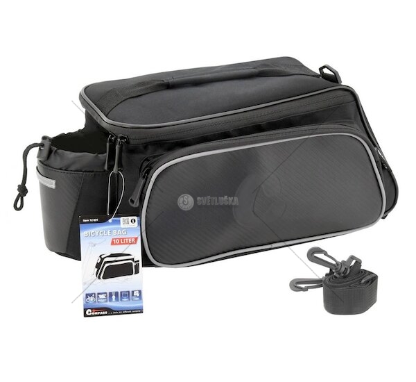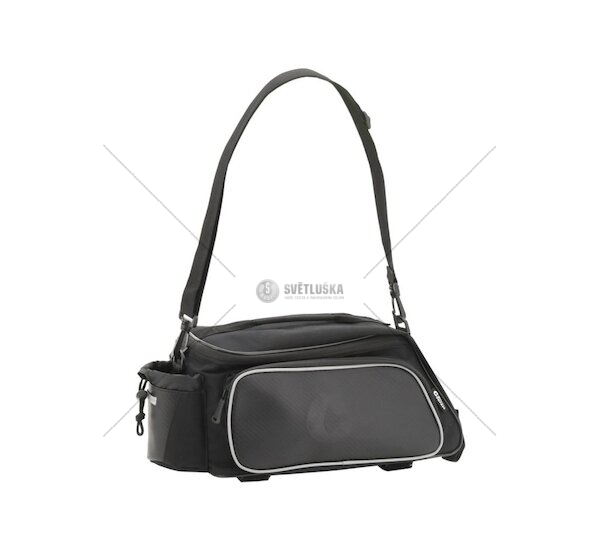 Praktická cyklotaška s několika kapsami, pro nosič jízdního kola. Brašna je opatřena hlavní 8L kapsou a dvěma 1L postraními kapsami. Veškeré kapsy jsou opatřeny zapínaním na zip. Zadní část brašny je doplněna pouzdrem na menší lahev, či pití v plechovce. Ve spodní části jsou umístěny nastavitelné přezky pro jednoduché upnutí u různých rozměrů nosičů. Brašnu je navíc možné po odepnutí z nosiče přenášet, díky odepínatelnému popruhu na vrchní straně. Materiál je doplněn o reflexní prvky, které zajistí Vaši bezpečnost, za snížené viditelnosti. Případné nečistoty lze lehce odstranit, díky použití materiálu, který je lehce omyvatelný a vzhledově připomíná karbonové vlákno.