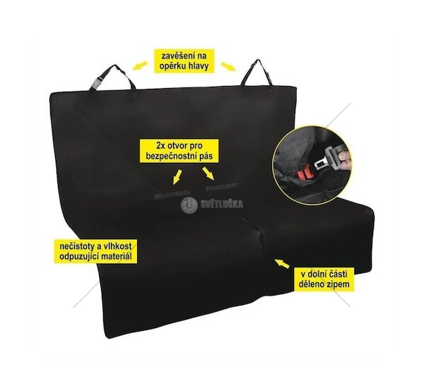 Deka je určena k upevnění na zadní sedadlo jednoduchým zavěšením za opěrky hlavy. Dva uzavíratelné otvory na bezpečnostní pásy, dolní část dělená zipem pro snadné přizpůsobení deky různým vozů. Deka je omyvatelná, použitý materiál odpuzuje nečistoty i vlhkost.
