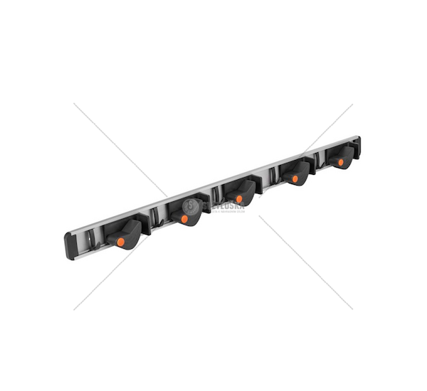 Praktický držák na nářadí BRADAS s 5 držáky a 5 háčky bez aretace na hliníkové liště v délce 79 cm. Ideální organizace nářadí v garáži, dílně nebo zahradním domku s maximální nosností 2 kg na jeden držák.