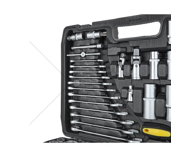 Gola sada K00099 obsahuje 216 ks nářadí a dílů ve velikostech 1/2", 3/8" a 1/4". Kompletní sortiment včetně ráčen, nástrčných hlavic, bitů, kloubů, prodloužení a dalších příslušenství umožňuje široké využití při opravách, údržbě i montážích. Nářadí je vyrobeno z kvalitní chrom-vanadiové oceli, která zajišťuje dlouhou životnost a odolnost proti opotřebení. Přehledné uspořádání v pevném kufru usnadňuje orientaci a přenášení celé sady. Ideální volba pro profesionály i domácí dílny.