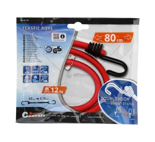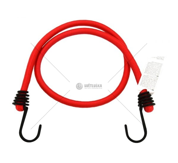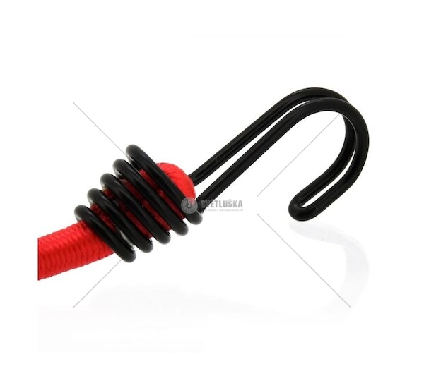 Upínací guma 80 cm. Velmi kvalitní upínač s homologací TÜV/GS, zakončený dvojitými kovovými háky Smart Fixing. ento pružný upínač se může chlubit extra pevným jádrem s průřezem o průměru 10 mm, zakončený zdvojenými, kovovými háky SMART FIXING, které se vyznačují tvarem usnadňujícím zachycení na místech, běžně nedostupných pro háky klasické.