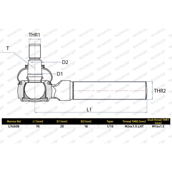 Hlava příčného táhla řízení MONROE L94G07 / L94G08 je náhradní díl určený pro systémy řízení vozidel. Dodává se s korunovou maticí a je opatřena levotočivým závitem. Rozměry závitů jsou M16x1.5 a M24x1.5 LHT. Celková délka tohoto dílu činí 95 mm, rozměr kužele je 18 mm a průměr trubky 27 mm. Hlava příčného táhla je kompatibilní s dílem L94G07. Balení má rozměry 12,3 cm (délka), 9,8 cm (šířka) a 5,1 cm (výška). Hmotnost se pohybuje mezi 0,664 a 0,724 kg. Tento díl je určen pro odbornou montáž v rámci údržby a oprav řídicího systému vozidla. Důkladná kontrola stavu ostatních komponent řízení je před instalací doporučena.