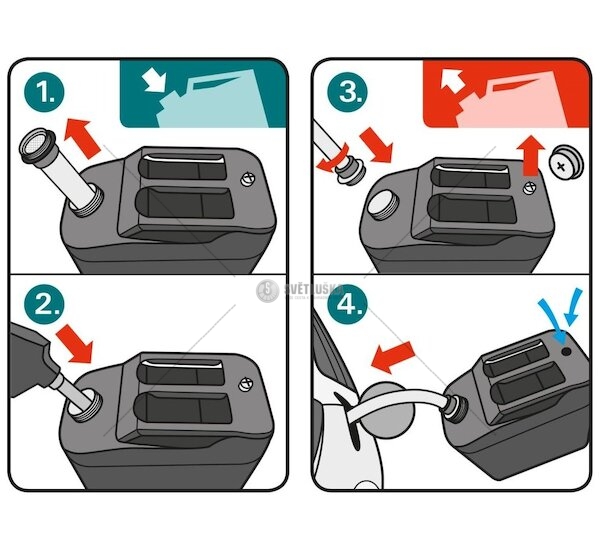 - odvzdušňovací šroub, který je nutno při vylévání tekutin z kanystru vyšroubovat (pro manipulaci s + profilem šroubu lze použít uzávěr kanystru, ve kterém je vylisována matrice s + profilem)