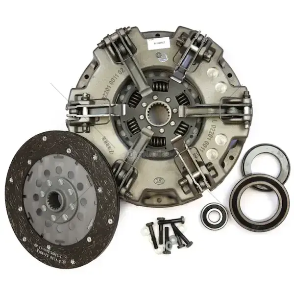 Kompletní spojka s převodovými ložisky 628312000 je sestava určená pro přenos krouticího momentu mezi motorem a převodovkou u traktoru. Zajišťuje odpojení a opětovné zapojení pohonu při řazení převodů; součástí jsou prvky spojky a integrovaná převodová ložiska, která umožňují rotaci a vzájemné ustavení jednotlivých částí spojkového mechanismu.