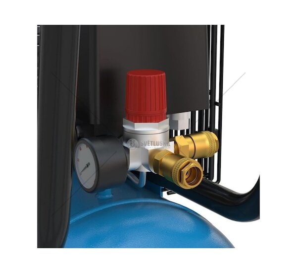 Dva manometry, dva výstupy stlačeného vzduchu, tlakový spínač, redukční ventil, pojistný přetlakový ventil, zpětný ventil, vzduchový filtr, dochlazovač, olejoznak, jistič motoru, ochranný (mřížový) kryt řemenu, tlaková nádoba o objemu 50 l, ventil pro vypouštění kondenzátu.