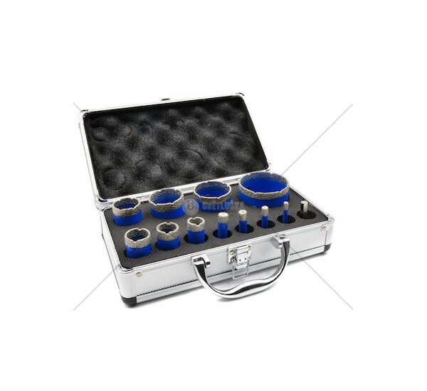 Sada korunkových diamantových vrtáků ve velikostech od 6 do 68 mm se závitem M14. Ideální pro vytváření otvorů v materiálech jako jsou: porcelám, keramické dlaždice, cihly, porobeton apod. Vrtáky jsou z vniřní strany zalité voskem, který přijímá teplo z vrtání a brání tak jejich přehřátí.