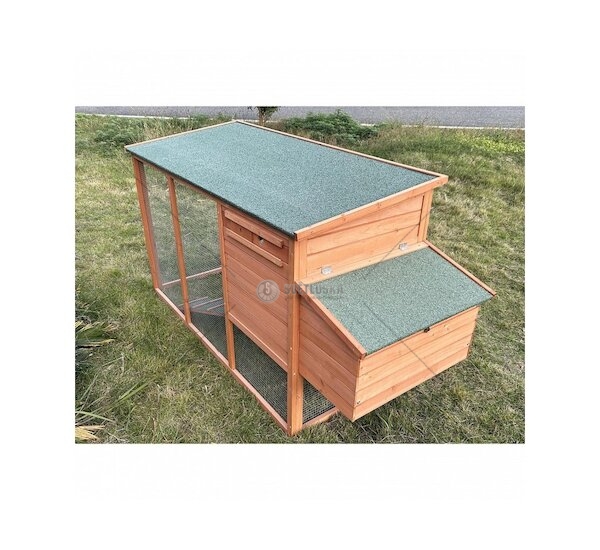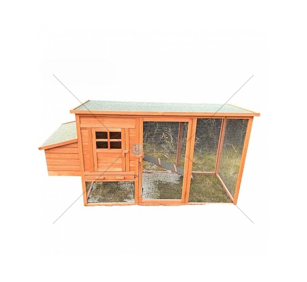 Vysoce odolná konstrukce z jedlového dřeva, chráněná proti povětrnostním vlivům povrchovou úpravou, zajišťuje dlouhou životnost i při umístění venku. Voděodolná asfaltová střešní krytina brání pronikání vody, sněhu i vlhkosti – slepice zůstávají v suchu za každého počasí. Pozinkované pletivo kolem výběhu chrání před predátory i zvědavými sousedy a zaručuje maximální bezpečí po celý den i noc.