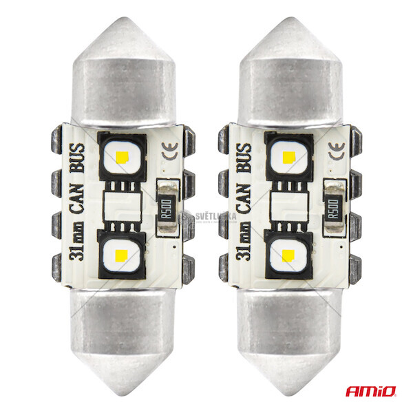 Autožárovky AMiO LED jsou moderním řešením využívajícím technologii LED. Použité diody vyzařují bílé světlo a neblikají. Vysoká kvalita zpracování zaručuje životnost žárovek až 50 000 hodin a speciální systém napájení nevyžaduje úpravu elektroinstalace v automobilu, což umožňuje bezproblémovou instalaci do tradičních svítidel, kde se dříve používaly běžné žárovky. VýHODY LED ŽáROVEK: • delší životnost oproti standardním žárovkám • nižší spotřeba energie • rychlejší čas zapnutí/vypnutí • odolnost proti nárazům • snadná montáž TECHNICKé úDAJE: • typ: C5W • napájení: 12/24V • typ diody: 3838 • počet diod: 2 SMD • barva světla: 5500 • vestavěný modul CANBUS • balení: 2 ks. Délka: 31 mm