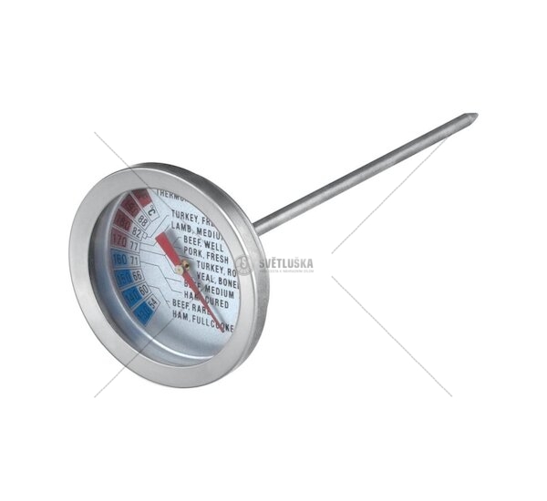Teploměr je vyroben z nerezové sondy, ciferník pak z hliníkového rámečku a sklíčka. Teploměr je určen pro měření teploty zapíchnutím do požadovaného pokrmu pro docílení přesného výsledku. V případě poškození sklíčka teploměr již nepoužívejte. Teploměr měří v °C i ve °F. V rámci teploměru je i nápověda odpovídajících hodnot pro pokrmy.