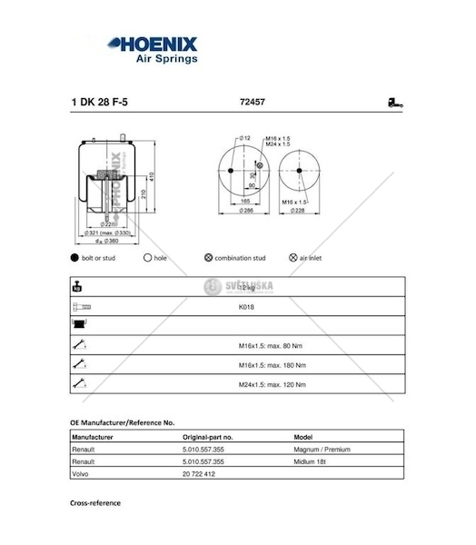 Kompletní měch rvi premium/magnum Phoenix 1DK28F-5 je určen pro použití v pneumatických systémech podvozku vozidel. Tento náhradní díl zajišťuje komfortní jízdu a optimální stabilitu vozidla. Měch je navržen pro vysokou odolnost a dlouhou životnost. Dodávaný kompletní měch obsahuje všechny potřebné komponenty pro snadnou instalaci. Jeho konstrukce umožňuje efektivní tlumení nárazů a vibrací, čímž přispívá ke zvýšení bezpečnosti a komfortu jízdy. Vnější průměr měchu je 321 mm a délka činí 412 mm. Měch je opatřen závity M16 x 1.5 a M24 x 1.5 pro snadné připojení k systému. Hmotnost měchu je 13402 gramů. Tento díl je vhodný pro náročné provozní podmínky a splňuje vysoké standardy kvality. Jeho robustní provedení zaručuje spolehlivý výkon a minimalizuje riziko poruch. Při správné instalaci a údržbě poskytuje měch dlouhodobou funkčnost a přispívá k celkové spolehlivosti vozidla. Díky své kvalitě a výkonu je tento měch ideální volbou pro náročné řidiče a profesionální servisní dílny. Zajišťuje optimální funkčnost systému odpružení a přispívá k bezpečné a pohodlné jízdě. Jeho instalace by měla být provedena kvalifikovaným personálem s použitím vhodného nářadí.