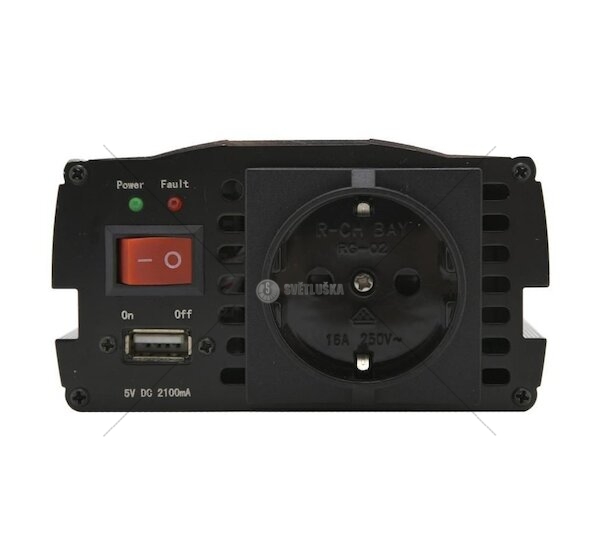 Výkonný měnič, určený pro univerzální použití, kdy je potřeba připojit síťové spotřebiče určené pro 230V/50Hz v místech s rozvodem 12 V=. Připojení napájecího napětí je řešeno pomocí 70 cm kabelů s klipsy pro akumulátor 12 V.