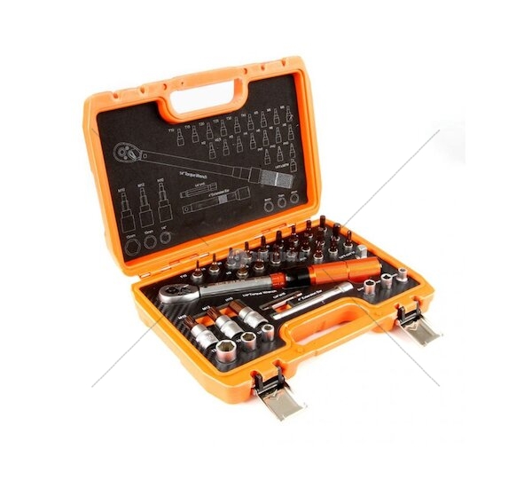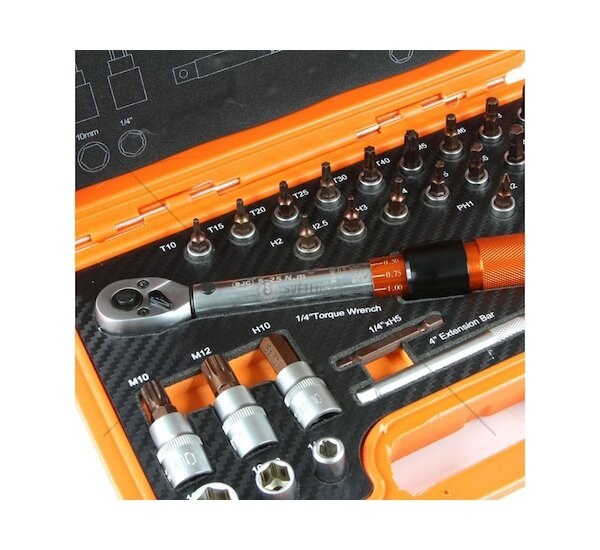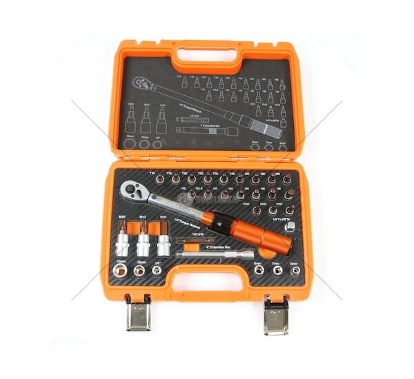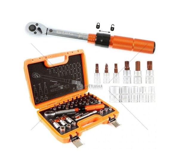 Momentový klíč 1/4", s rozsahem 5 - 25 Nm v sadě s 31 ks příslušenství, zástrčných hlavic Torx, nástrčných klíčů atd. Tato sada je zejména vhodná pro údržbu cyklistických kol a dalších zařízení, citlivých na dotahování. Tento kalibrovaný klíč je ideální volbou pro profesionály i nadšené domácí kutily, kteří vyžadují spolehlivost a přesnost při práci. S jeho pomocí lze snadno dosáhnout požadovaného momentu utažení, což je klíčové pro zajištění optimální funkčnosti a bezpečnosti mechanických sestav.