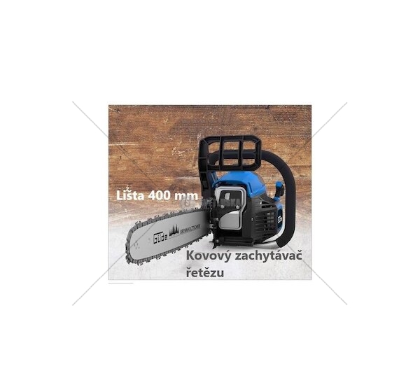 výkon motoru 1.4kW, zdvihový objem válce 38.2cm³, volnoběžné otáčky 10300ot/min, délka lišty 400 mm, rychlost řetězu 22m/s