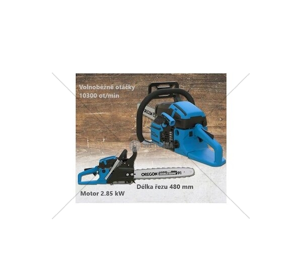výkon motoru 2.85kW, zdvihový objem válce 63cm³, volnoběžné otáčky 10300ot/min, délka lišty 500 mm, rychlost řetězu 22m/s