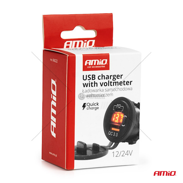 Nabíječka do auta USB + USB-C se spínačem a voltmetrem QC3.0 12/24V vodotěsná AMiO-04222