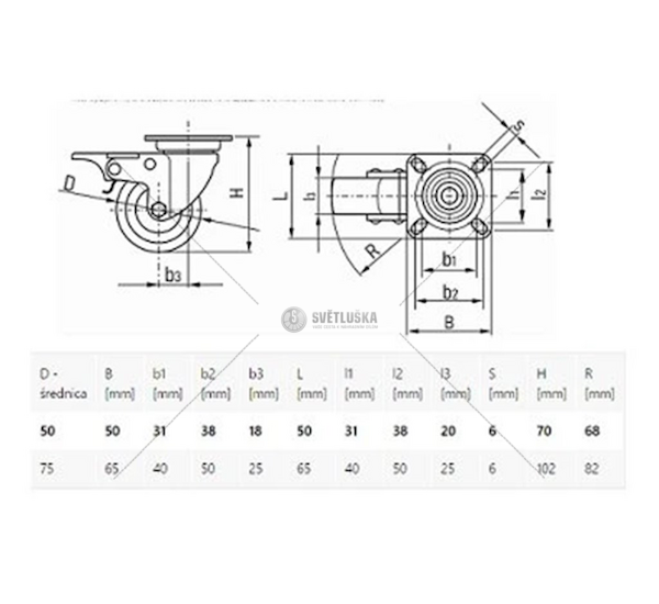 Otočné kolečko o průměru 50 mm.