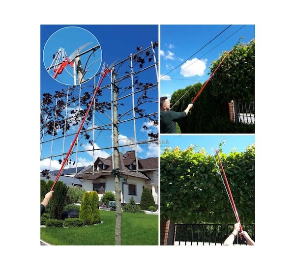 Potřebujete prostříhat nebo prořezat koruny vysokých stromů bez nutnosti použití žebříku? Tyto teleskopické nůžky s odnímatelnou pilkou vám to umožní. Pomocí teleskopické rukojeti s rozpětím 120 - 225 cm prostříháte větve až do tloušťky 20 mm a na silnější větve použijete pilku s ostřím v délce 35 cm. Ovládání nůžek je jednoduché, pomocí nylonové šňůry. Díky pákovému mechanismu na střih není třeba velké síly.