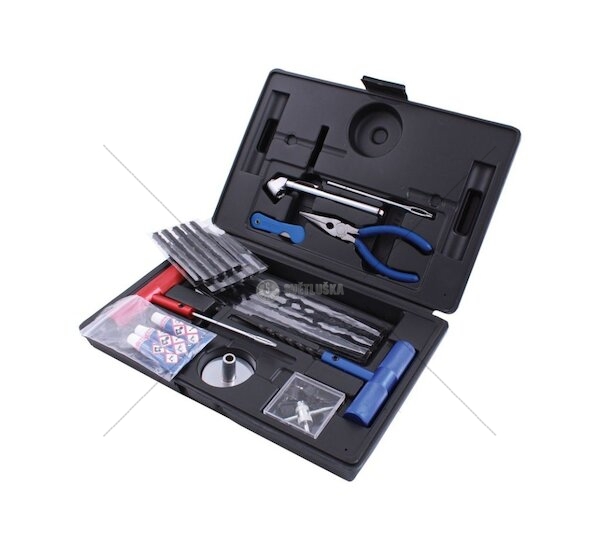 Komplexní opravná sada potřeb nejen pro pneuservis. Obsahuje základní vybavení pro servis poškozených – propíchnutých bezdušových pneumatik. Dodávána v kufříku z tvrdého plastu.