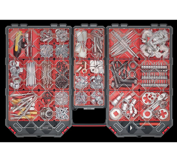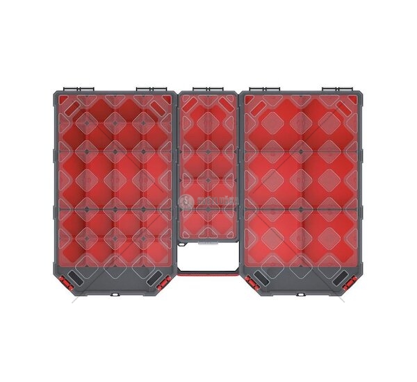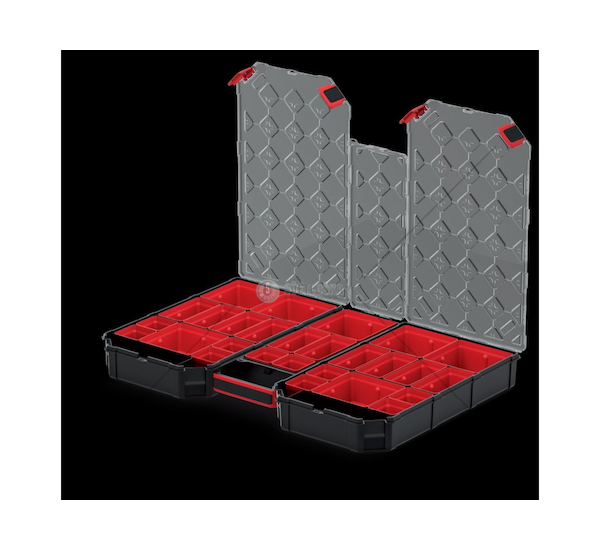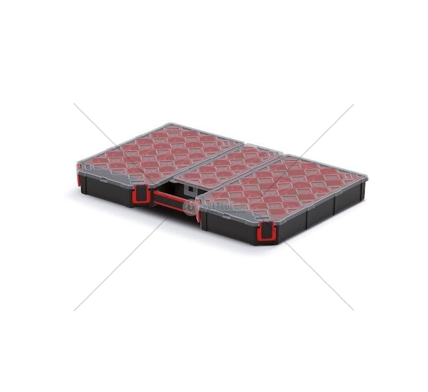 Průhledné plastové víko z polykarbonátu (PC), vnitřní vyjímatelné boxy na montážní materiál. Ergonomický úchyt.