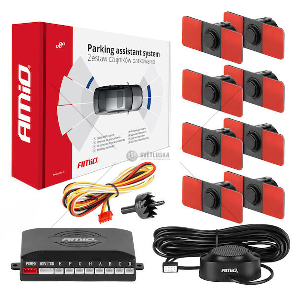 Parkovací asistent je zařízení, které podporuje parkování a couvání vozidla. Pracuje na principu sonar - vyzařuje ultrazvukové vlny, které, když se odrážejí od překážky, umožňují určit vzdálenost mezi vozidlem a překážkou. Během couvání přístroj správně rozpozná překážky v dráze vozidla a upozorní řidiče signalizací zvukem. N ové snímače jsou namontovány z vnitřní strany nárazníku a nevyčnívají nad jeho obrys. Malá velikost z nich dělá velmi atraktivní vzhled. Snímače mohou být natřeny. Doporučuje se aplikovat maximálně dvě tenké, rovnoměrné vrstvy laku. Bzučák může pracovat ve 3 režimech zvuku: vysoký, nízký a zcela ztlumen. Změna režimu přepínačem na krytu. Souprava obsahuje: 8 detektorů (snímače) černá vnitřní 16,5mm 4 prodlužovací kabely Bzučák - vydává zvukové signály 8-senzorová řídící jednotka-centálka (A-D zadní, E-H přední) Pilový otvor pro vrtání otvorů v nárazníku Návod k montáži úplná specifikace: Rozsah / citlivost provozu 0-2,5m Napájení 12V Provozní frekvence 40KHz Pracovní teplota -30 ° C - +70 ° C Montážní průměr 16,5mm