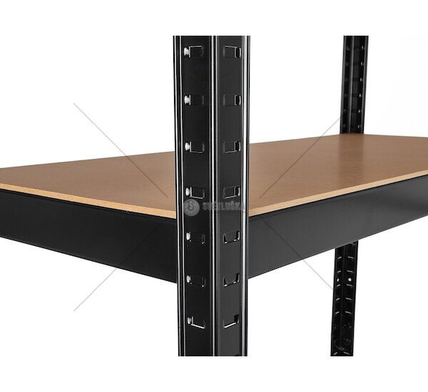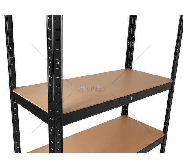 Konstrukce je opatřena černým práškovým lakem, který zvyšuje odolnost proti poškrábání a korozi a zároveň dodává regálu moderní, čistý vzhled vhodný nejen do technických prostor, ale i do prodejen či zázemí obchodů. Každá police je navíc vyztužena ocelovou příčkou, což výrazně zvyšuje stabilitu a eliminuje prohýbání MDF desky i při vysokém zatížení.