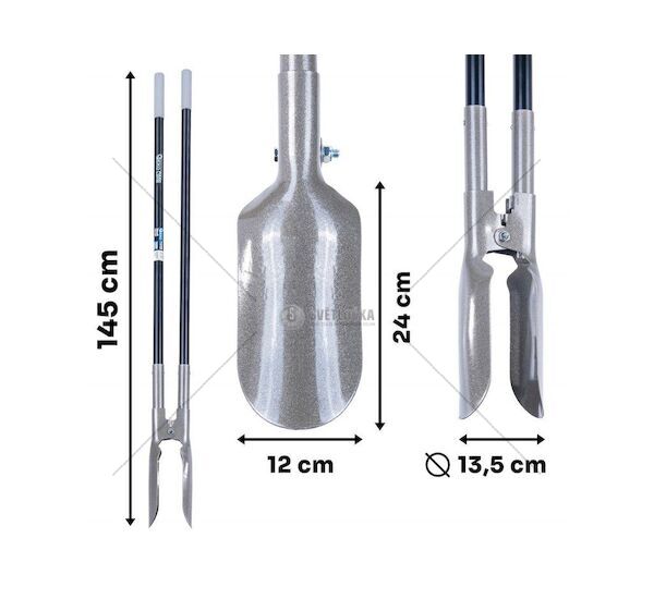 Dvě lžíce (12 × 24 cm) po zarytí do země a roztažení rukojetí sevřou zeminu a umožní její vytažení. Výsledné rovnoměrné otvory mají průměr přibližně 13,5 cm.