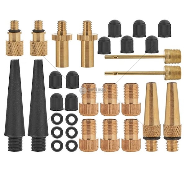 Sada jehel, těsnění a redukcí ventilků Schrader (AV), Presta (SV/FV) a Dunlop (DV) představuje nenahraditelný a všestranný doplněk pro každého cyklistu či majitele jízdního kola. Tato kompletní sada se stává neocenitelným nástrojem při huštění různých pneumatik jízdních kol a poskytuje všestranné využití i při nafukování míčů, matrací a dalších hraček.