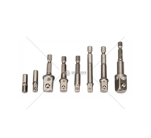 Sada šestihranných adaptérů pro nástrčné klíče 1/4", 3/8", 1/2". Adaptéry vyrobeny z oceli, povrch je navíc oxidovaný, což zaručuje odolnost a dlouhou životnost. Sada se používá pro montážní práce s akumulátorovou vrtačkou.