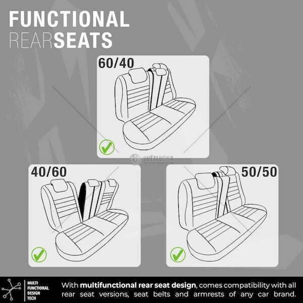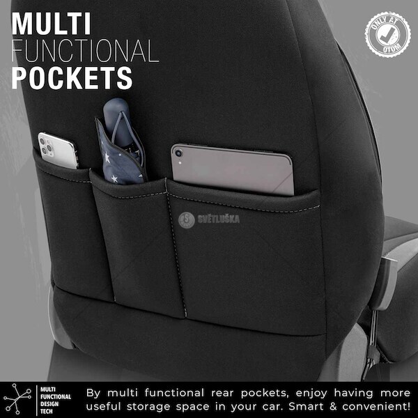 Výrobek je vyroben z nejkvalitnějších potahových látek. Kombinace nejlepších materiálů a vysoká pozornost věnovaná detailům při výrobě zajišťuje exkluzivní vzhled a mimořádnou odolnost, jakož i vynikající ochranu sedadel před nečistotami a oděrkami. Standardní potahy mají certifikovaný šev AIRBAGový, díky čemuž jsou vhodné jak pro auta s bočními airbagy v sedadlech, tak i pro standardní sedadla. Díky použití speciálního švu pokrývají sedadla zcela, aniž by narušovala práci AIRBAGŮ. Samozřejmě, toto řešení bylo mnohokrát testováno a certifikováno. Všechny materiály jsou plně laminovány polyuretanovou pěnou, která zabraňuje pohybu potahů vůči sedadlům. Potahy zcela zakrývají sedadla, která dokonale chrání sedadla před nečistotami, jsou odolná a snadno se čistí a díky svým módním vzorům osvěží interiér a zlepší jeho estetiku. Potahy mají zapínání na zadním sedadle, díky čemuž pasují na většinu sedadel dostupných na trhu (nedělené pohovky). Potahy nemají výřezy pro pásy a zadní opěrky hlavy z důvodu jejich použití pro různé modely aut. Potřebné otvory si musíte udělat sami po precizním osazení a montáži. Potahy jsou vyrobeny z pěnových laminovaných materiálů a podšívky, takže se nešpiní. Produkt vysoké kvality šitý v Turecku, tato země je známá svými šicími místnostmi na velmi vysoké úrovni. Alfa Romeo: 147, 156, 159, Brera, Giulia, Guilietta, Mito, Stelvio, 145, 146, Audi: A1, A3, A3, A4, A5, A6, A7, Q2, Q3, Q5, Q7, A8, TT, BMW: Rad 1, séria 2, séria 3, séria 4, séria 5, séria X1, X2, X3, X4, X5, X6, séria 7, Chery: Tiggo, Alia, Kimo, Chevrolet: Aveo, Camaro, Captiva, Cruze, Epica, Kalos, Lacetti, Rezzo, Spark, Suburban, Tahoe, Trax, Avalance, Chrysler: 300C, Citroen: Berlingo, C1, C2, C3, C4, C4 Cactus, C4 Grand Picasso, C4 Picasso, C5, C-elysee, Ds3, Ds4, Ds5, Nemo, Saxo,Xsara, Xsara Picasso, Jumper, Jumpy, Dacia: Dokker, Duster, Duster, Lodgy, Logan, Sandero, Sandero Stepway, Daihatsu: Materia, Terios, DFM: bohatý, úspešný, Dodge: Nitro, Fiat: 124 Spider, 500, 500C, 500L, 500X, Albea, Brava, Bravo, Doblo, Egea, Fiorino, Grande Punto, Linea, Marea, Palio,Panda, Sedici, Stilo, Siena, Tempra, Tipo, Freemont, Fullback, Ducato, Ford: B-max, C-max, Connect, Escort, Fiesta, Focus, Fusion, Kuga, Mondeo, Mustang, Tourneo Courier, Ka, Exp-lorer, Ranger: Gelly, Emgrand, Honda: Accord, City, Civic, Honda, Cr-v, Jazz, Hyundai: Accent, Elantra, Getz, i10, i20, i30, Santa Fe, Tucson, ix35, Matrix, H 1, H 100, Starex, Isuzu: D-Max, Iveco, Daily, Jaguar, X-Type, Jeep: Cherokee, Compass, Grand Cherokee, Renegade, Patriot, Kia: Ceed, Cerato, Niro, Picanto, Rio, Sorento, Soul, Sportage, Pregio, Land Rover: Evoque, Freelander, Range Rover, Discovery, Mazda: 323, 626, 3, Mpv, séria B, Mercedes: Séria 190, séria A, séria B, séria C, Cla, Clk, Cls, séria E, séria gl, Gla, Ml, séria S, Citan, Sprinter,Vito, Vivano, Mini, Cooper, Countryman, Mitsubishi: Asx, Attrage, Colt, Lancer, Carisma, Pajero, Outlander, L 200, L 300, Nissan: Almera, Tino, Juke, Micra, Note, Primera, Pulsar, Qashqai, X-Trail, Terrano, Navara, Opel: Astra G, Astra H, Astra J, Astra K, Combo, Corsa, Grandland, Insignia, Meriva, Mokka, Vectra, Zafira, Vivaro, Movano, Peugeot: 206, 207, 208, 301, 206, 307, 308, 406, 407, 508, 2008, 3008, 5008, Bipper, Partner, Partner Tepee, RCZ,106, 306, Boxer, Expert, Porsche: Cayenne, Panamera, 911, Renault: Captur, Clio, Fluence, Kadjar, Kangoo, Laguna, Latitude, Megane, Modus, Scenic, Grand Scenic, Symbol,Talizman, Twingo, 9, 12, 19, 21, Koleos, Majster, Trafic, Seat: Altea, Altea XL, Cordoba, Exeo, ibiza, Leon, Toledo, Ateca, škoda: Fabia, Kodiaq, Octavia, Rapid, Roomster, Superb, Yeti, Ssangyong: Tivoli, Kyron, Rexton, Actyon, Korando, Subaru, Forester, impreza, XV, Suzuki: Alto, Swift, SX4, Grand Vitara, Vitara, Baleno, Jimny, Alto, Baleno, Jimny, Tata, Xenon, Telcoline, Toyota: Auris, Avensis, CH-R, Corolla, RAV-4, Verso, Yaris, Land Cruiser, Hilux, Hi-Ace, Volkswagen: Beetle, New Beetle, Bora, Caddy, E-Golf, Golf, Jetta, Passat, Passat CC, Polo, Scirocco, Sharan, Tiguan,Touareg, Touran, Vento, Amarok, Transporter, Crafter, Caravelle, Multivan, LT, Volvo: S 40, S 60, S 80, S 90, V 40, XC 60, XC 90, XC 70
