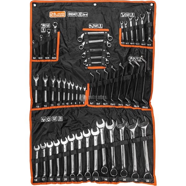 - Sada obsahuje všechny nejdůležitější klíče používané v dílnách: zahnuté očkové klíče, kombinované klíče, na čerpadla a startéry, TORX, na hydraulická vedení.