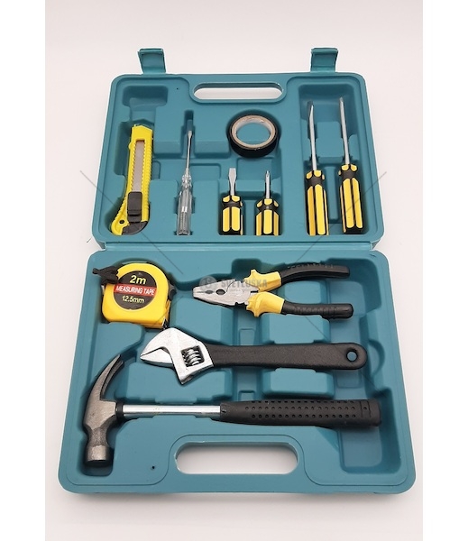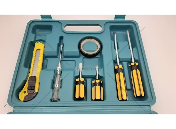 - 1 ks Zednické kladivo - 2 ks malých šroubováků - 2 ks. Velké šroubováky - 1 ks měřicí pásky 2m - 1 ks kleště - 1 ks nůž na tapety - 1 ks. Pero - 1 ks nastavitelný klíč - 1 ks izolační páska- Hmotnost (kg):1