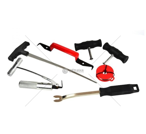 Profesionální sada k odstranění čelního skla vozidla. Sada se skládá ze 7 elementů, které zajistí řádné provádění řezu.