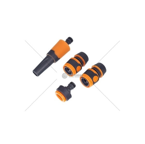 Základní sada pro zalévání zahrady. Obsahuje v jednom balení vše potřebné pro připojení zahradní hadice. 4 kusy v sadě jsou vyrobeny z odolného plastu, který jen tak nezkřehne.