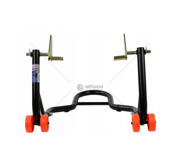 Stojan pod motorku, přední a zadní, sada. Nosnost 270kg, zadní + přední stojan. Nastavení šířky, masivní konstrukce, manipulační kolečka