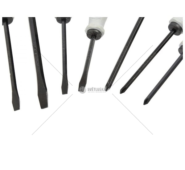 Sada 7 ks šroubováků. Materiál CrV, kalené hroty. Úderové šroubováky mají ocelové jádro průchozí skrz rukojeť a na jejijich konci je úderová plocha z Chrom - Vanadiové oceli.