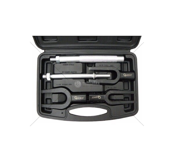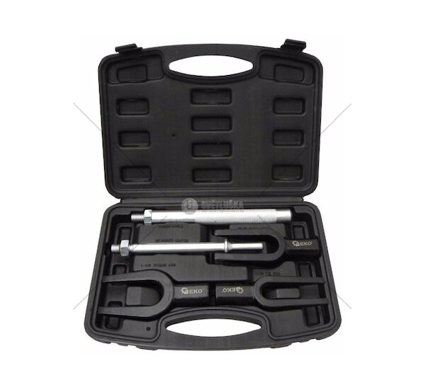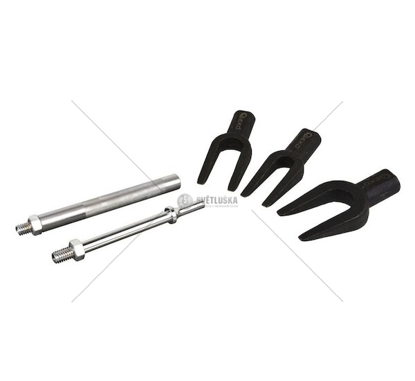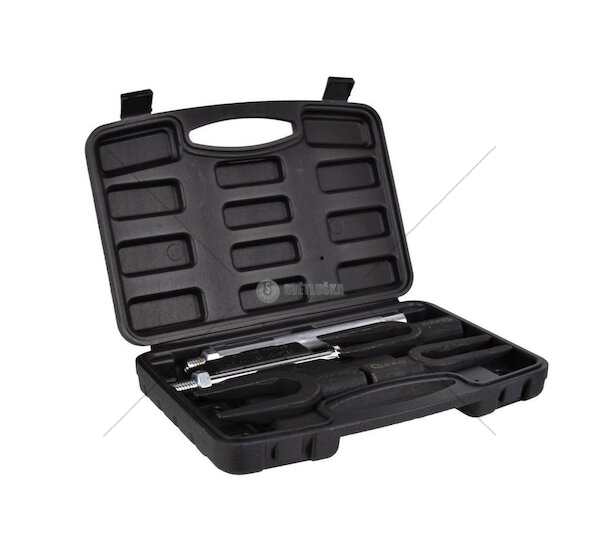 Sada výsuvných šroubů pro řídící tyče a kulové čepy z chrom-vanadové oceli (CrV). Sada obsahuje tři vidlicové klíče s vnitřní šířkou 28, 24, 17 mm a dvě upínací rukojeti, přizpůsobené pro práci s pneumatickým nebo ručním kladivem. Tažná ramena stahováku mají trvanlivé a rovnoměrné klínové plochy, které umožňují snadné a přesné zpevnění kulových čepů a řídících tyčí.