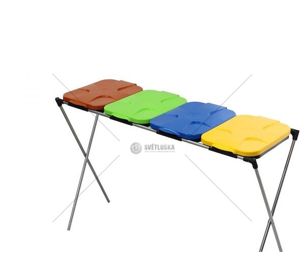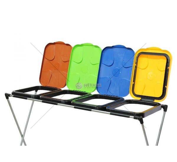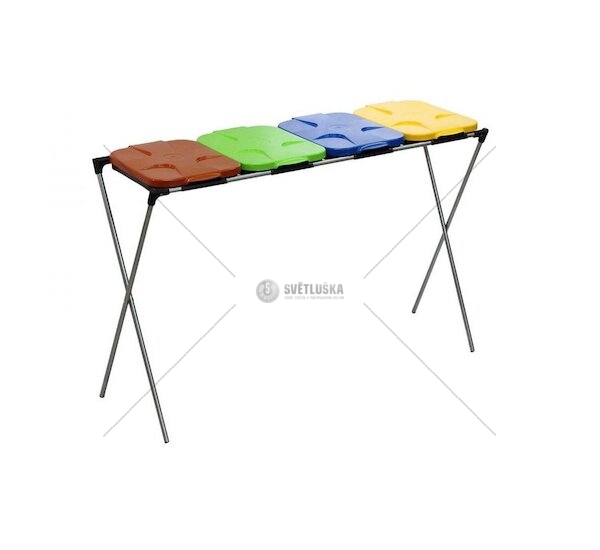 Stojan má žlutý, modrý, zelený a hnědý plastový poklop. Vhodné pro pytle, sáčky o objemu 120 až 240 litrů.
