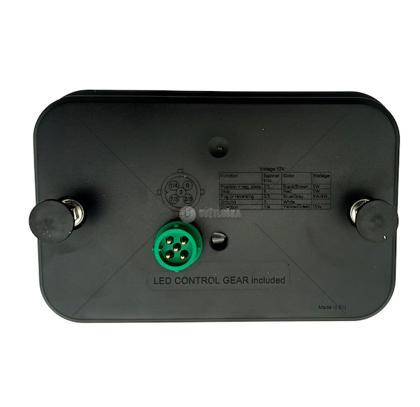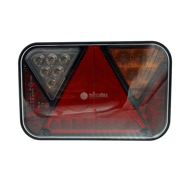 Levá strana po směru jízdy. Funkce: Brzda, poziční osvětlení, blinkr, mlhové osvětlení, Včetně integrovaného odrazového trojúhelníku. 5-pinový konektor na zadní straně svítilny. Rozteč šroubů : 150mm- Hmotnost (kg):0,3