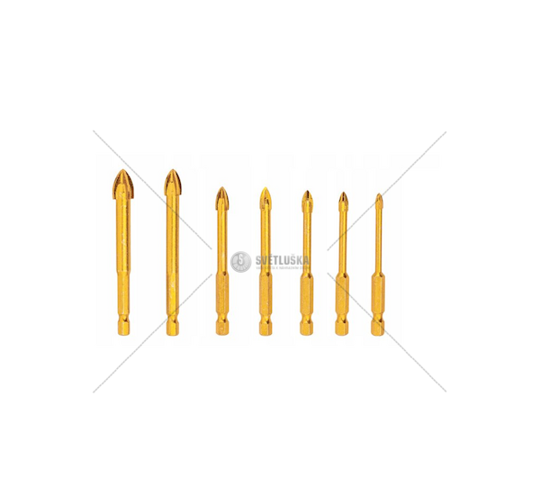 Sada multifunkčních vrtáků určená pro bezpříklepové vrtání do dřeva, plastu, hliníku, cihel, skla, keramiky. Jsou vyrobeny z karbidové oceli, která dodatečně chrání vrták proti příliš rychlému opotřebení. Vrtací prvek se skládá ze čtyř řezných nožů.