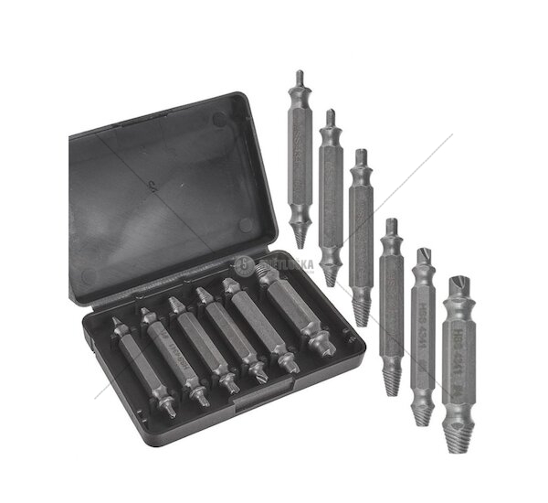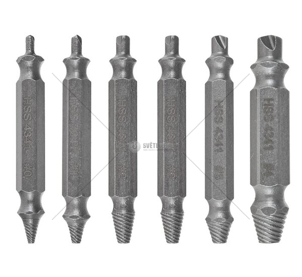 Každý z vytahováků v sadě je oboustranný. Na jedné straně je vrták pro předvrtání, který snadno pronikne i do těch nejodolnějších materiálů. Opačná strana je určená k samotnému vytočení poškozeného šroubu.