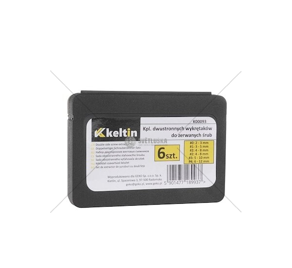 Sada oboustranných vytahovačů zalomených šroubů KELTIN je určená pro odstranění poškozených šroubů o průměru 2 až 12 mm. Tato sada obsahuje šest vytahováků různých velikostí, které poskytují flexibilitu při práci s různými typy a velikostmi zalomených šroubů. Každý vytahovák je vybaven dvěma koncovkami – jedna strana slouží k předvrtání do poškozené části šroubu a druhá k jeho vytažení.