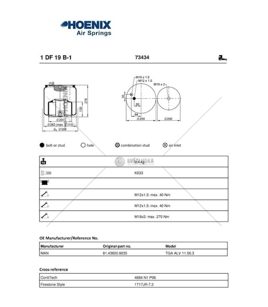Pneumatické odpružení PHOENIX 1DF19B-1 je určeno pro zadní nápravu vozidel. Tento díl slouží k zajištění komfortu jízdy a stability vozidla díky tlumení nerovností. Pneumatické odpružení, známé také jako vzduchové odpružení, využívá stlačený vzduch k absorpci nárazů a vibrací, čímž zlepšuje jízdní vlastnosti a bezpečnost. Pneumatické odpružení 1DF19B-1 je vhodné pro výměnu opotřebeného nebo poškozeného dílu a přispívá k udržení optimálního stavu podvozku. Montážní strana je zadní náprava. Hmotnost tohoto dílu je 9062 gramů. Vnitřní průměr odpružení je 180 mm, vnější průměr je 259 mm a délka činí 503 mm. Na tento produkt se vztahuje záruka 2 roky. Správná funkce odpružení je zásadní pro bezpečnost a komfort jízdy. Pravidelná kontrola a včasná výměna opotřebených dílů zajišťují optimální jízdní vlastnosti a brání vzniku dalších problémů s podvozkem.