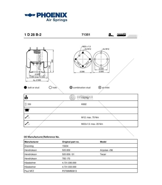 Měch pneumatického odpružení PHOENIX 1D28B2 je určen pro použití v systémech pneumatického odpružení vozidel. Tento náhradní díl zajišťuje komfortní jízdu a stabilizaci vozidla. Měch pneumatického odpružení, také označovaný jako pneumatický měch, absorbuje nerovnosti vozovky a přispívá k optimálnímu kontaktu pneumatik s vozovkou. PHOENIX 1D28B2 je navržen pro spolehlivý provoz a dlouhou životnost. Díky svým rozměrům a závitům je zajištěna kompatibilita s širokou škálou vozidel. S váhou 13585 g a specifikovanými rozměry (vnější průměr 286 mm, průměr do 320 mm, délka 420 mm) a závity (M12, M22 x 1,5) je tento měch vhodný pro náhradu opotřebených nebo poškozených komponent pneumatického odpružení. Poskytujeme záruku 2 roky na veškeré vady materiálu a zpracování. Pro správnou funkci systému pneumatického odpružení doporučujeme pravidelnou kontrolu stavu měchů a včasnou výměnu při zjištění poškození.