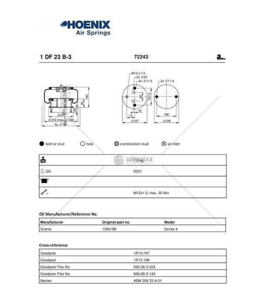Kompletní vzduchový měch Phoenix 1DF23B-3 určený pro nákladní vozidla Scania řady P, G, R a S. Tento díl slouží k zajištění komfortního odpružení a stabilizace vozidla. Vzduchový měch je navržen pro spolehlivý provoz a dlouhou životnost. Jeho konstrukce umožňuje efektivní tlumení nárazů a vibrací, což přispívá ke zvýšení bezpečnosti a komfortu jízdy. Vzduchový měch Phoenix 1DF23B-3 je vyroben s důrazem na kvalitu a přesnost, aby splňoval náročné požadavky profesionálního provozu. Jeho instalace by měla být provedena kvalifikovaným personálem s použitím vhodného nářadí a dodržením bezpečnostních předpisů. Při výměně vzduchového měchu se doporučuje zkontrolovat stav okolních komponent, jako jsou hadice, držáky a ventily, a v případě potřeby je také vyměnit. Tím se zajistí optimální funkčnost celého systému odpružení. Vzduchový měch je dodáván jako kompletní sada, připravená k montáži. Hmotnost tohoto dílu je 6946 gramů. Průměr měchu je 320 mm a délka činí 190 mm. Velikost závitu je M12 x 1.5. Při správné instalaci a údržbě poskytuje tento vzduchový měch dlouhodobou spolehlivost a výkon.