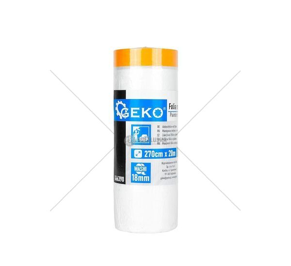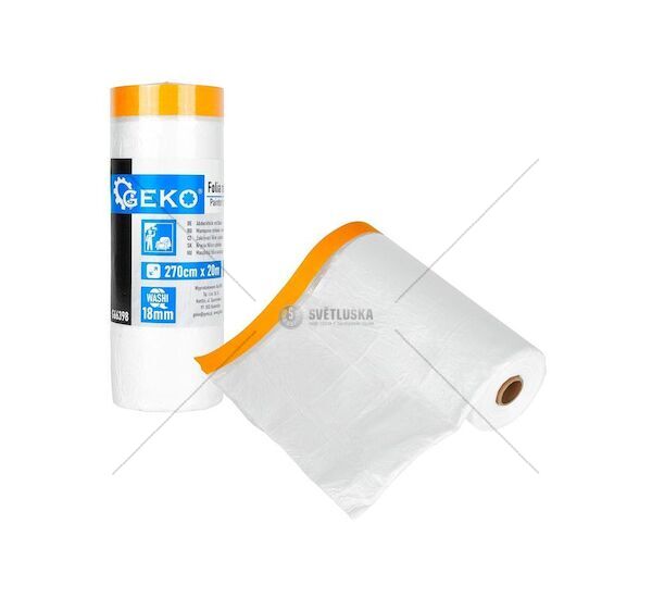 Zakrývací fólie s washi páskou GEKO slouží k rychlé ochraně velkých ploch při malování, lakování nebo renovacích. Kombinuje HDPE fólii s integrovanou lepící páskou v šířce 18 mm, kterou stačí přilepit k okraji chráněné plochy a fólii jedním pohybem rozvinout. Je vhodná pro profesionální malířské firmy a všechny, kteří připravují místnosti k malování nebo renovaci.
