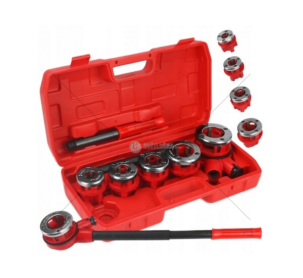 Závitníky v palcové soustavě, určené na řezání závitů na potrubí. Sada obsahuje 5 litinových závitníků se 4 noži z nástrojové oceli, ráčnovou hlavu a dvojdílnou rukojeť. Vše je uloženo v plastovém kufříku.