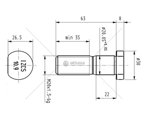 Šroub kolový MB M20*1,5*62 CSY AZME-0008 je určen pro upevnění kol u vozidel Mercedes-Benz. Tento šroub kola je opatřen vnějším závitem M20 x 1,5 a délkou 62 mm. Je vyroben z oceli a povrchově upraven fosfátováním pro zvýšení odolnosti proti korozi. Šroub kolový se vyznačuje jakostí/třídou 10.9. Délka driku šroubu je 20 mm a výška hlavy šroubu 8 mm. Průměr hlavy šroubu činí 30 mm. Délka žroubu pod hlavou je 62 mm. Průměr vlákna je 35,5 mm a celková délka šroubu je 70 mm. Hmotnost šroubu je 0,176 kg. Tento díl je vhodný pro údržbu a opravy kol u vozidel Mercedes-Benz, kde je vyžadována specifická délka a závit šroubu. Před instalací se ujistěte, že šroub kolový je kompatibilní s konkrétním typem kola a nábojem. Pravidelná kontrola a výměna šroubů kol je důležitá pro zajištění bezpečnosti a správné funkce brzdového systému. Zvolte kvalitní šrouby kol pro spolehlivé upevnění kol.